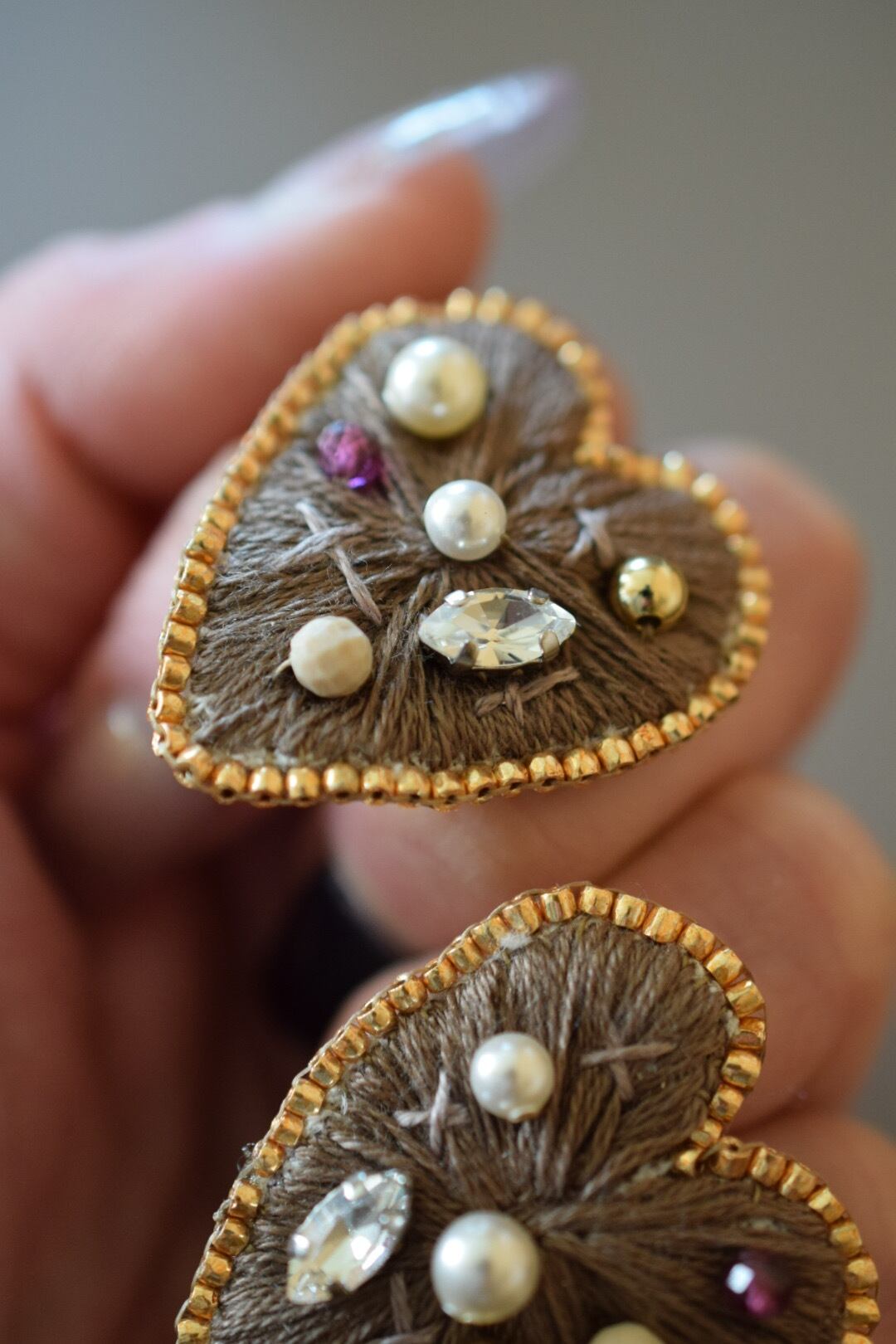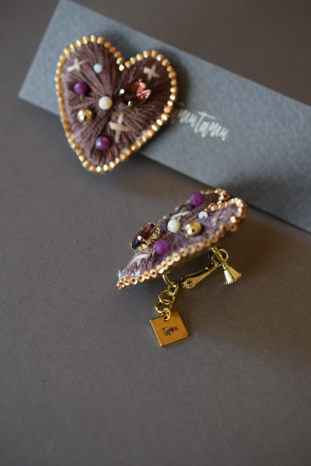 落ち着いた刺繍糸でかたどったハートに、