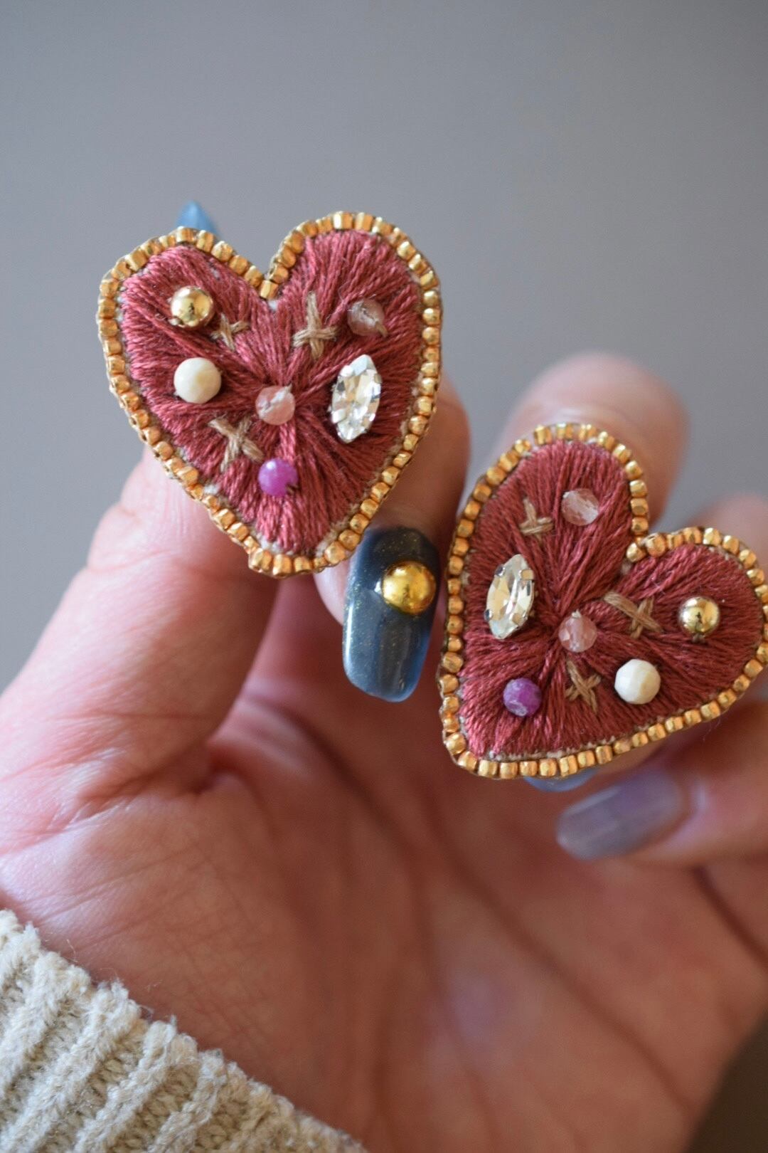 落ち着いた刺繍糸でかたどったハートに、